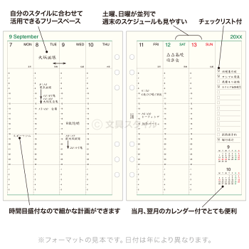 【週間・見開き両面1週間・バーチカル・時間目盛付】 人気のバーチカルタイプ。